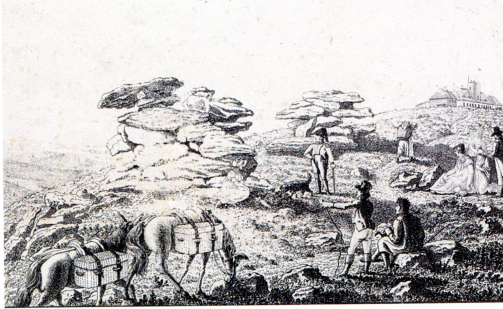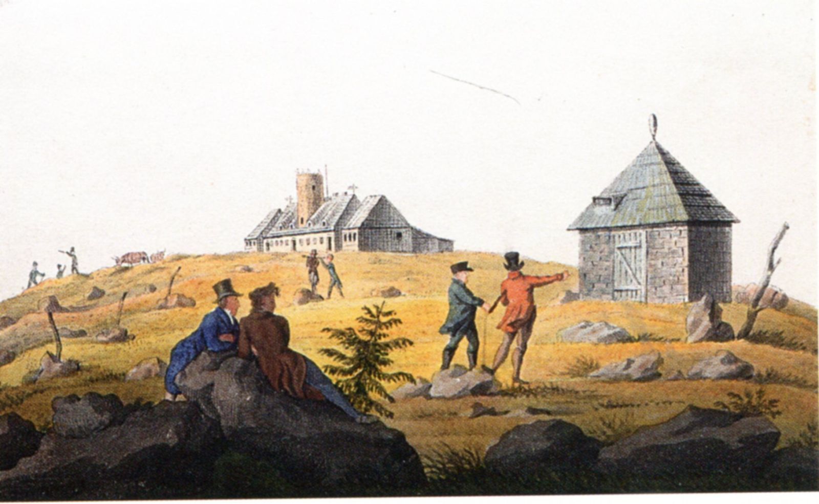 Carl Gustav Carus malte das Brockenhaus 1820 aus nordöstlicher Richtung. Linkerhand ist ein Stück vom 1736 errichteten Wolkenhäuschen zu sehen. Diese Wetterhütte aus Stein mit hölzernem Spitzdach, Moos in den Steinritzen und einer Bank darin war bei Goethes Besuch 1777 das einzige Gebäude hier oben.