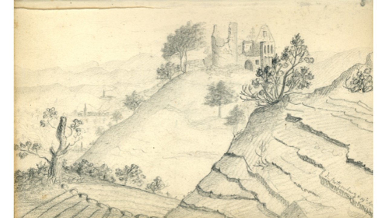 Standort dieses Malerblicks war die alte Reichsburg Kyffhausen, genauer deren Unterburg. Von hier sehen wir über einen Abgrund hinüber zur Oberburg auf den Barbarossaturm, am Abhang dahinter die Rothenburg, rechts die Goldene Aue und in der Ferne den Harz mit dem Brocken. Natürlich hat der Barbarossaturm seinen Namen durch die bekannte Sage erhalten, nach welcher der staufische Kaiser hier unten im Berg noch lebt und eines Tages das zersplitterte Deutschland endlich wieder einen wird. Die Burg war ein vielbesuchter Ort gerade seit den Zeiten der nationalen Bedrohung während der napoleonischen Krieg und den Befreiungskämpfen. Das zeigt uns der Dresdner Maler durch eine Gruppe junger Männer im Vordergrund; hier hat er sich auch selbst mit ins Bild gebracht. Heute stehen wir auf der Terrasse des Kyffhäuserdenkmals und können die Aussicht genauso erleben. Aber der Blick von der Unterburg ist durch den Denkmalsbau von 1890 bis 1896 versperrt. Für gewaltige neue Terrassenmauern wurden alte Burgmauern beseitigt. Das wilhelminische Deutschland, das zwanzig Jahre später loszog um draufzuhauen, präsentiert hier schon mal seine Träume von Einigsein als Vollender der Träume Kaiser Barbarossas. Die Ansicht bewahrt uns die Erinnerung an eine der größten deutschen Burgen von über 300 Metern Länge und regt an zum Nachdenken über Patriotismus und Nation – schwierige Themen für uns Deutsche.