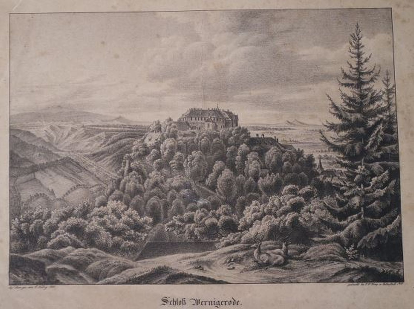 Das Schloss liegt auf einem Felssporn des Agnesberges. Die eigentliche Bergkuppe aber ist 20 Meter höher und unser Malerblick-Standort. Dieser hohe Standort, der die Landschaft dahinter vor unseren Augen ausrollt, ist der besondere Reiz des Blattes, was der Vergleich mit einer handelsüblichen Vedute rasch zeigt. Auf der Zeichnung von Georg Heinrich Crola sehen wir das Schloss noch in seiner barocken Form unter Graf Henrich von Stolberg-Wernigerode. Damals galt das stille Wernigerode als „Ort im Winkel“. Eine Generation später aber kam ein Umbau in einer Üppigkeit und Dichte von Einfällen, Dekoren und Materialien, der ein Höhe- und Endpunkt der historistischen Epoche sein wird. Neuschwanstein mag hier einfallen und das wäre nicht zu hoch gegriffen. Zu besichtigen sind etwa der Festsaal, an welchem Kaiser speisten, der Rauch-Salon, das Schreibkabinett, die neogotische Schloßkirche und natürlich die Königsräume, die auf Besuch aus Berlin warteten.