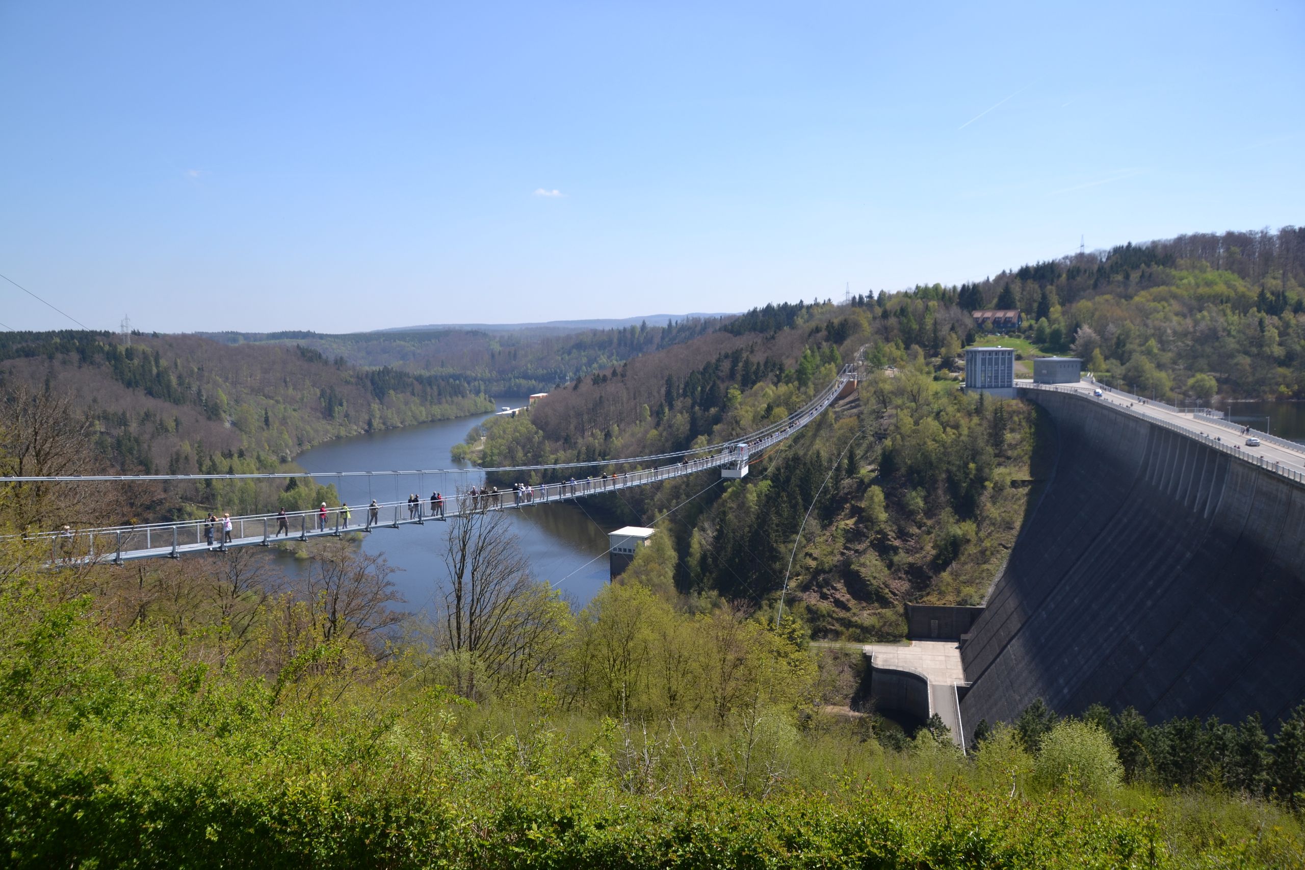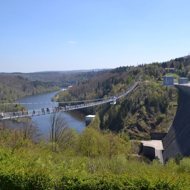 Seit 2017 spannt sich die Hängebrücke Titan-RT, eine der längsten Seilbrücken ihrer Art, über 75 Meter hoch über die Rappbodetalsperre. Dieses spektakuläre Bauwerk mit einer Länge von 458 Metern lockt zahlreiche Abenteuerlustige in den Harz. Wer noch mehr Nervenkitzel sucht, kann sich auf den Gigaswing wagen, der sich direkt unterhalb der Titan-RT befindet, oder mit der Megazipline über die Wasseroberfläche fliegen. Nervenkitzel pur!
