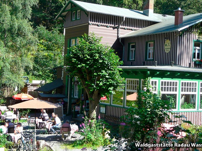 Dem Symbol folgend geht es ins Radautal. Erst auf einer Forststraße, dann auf einem schmaleren Pfad mit Liegebank und anschließend direkt am Flusslauf entlang erfolgt der Abstieg bis zum Taternbruch. Das nächste Ziel ist der Radau-Wasserfall mit der Waldgaststätte. Über die Treppe am Wasserfall wird der Weg in Richtung Bad Harzburg erreicht. Er führt parallel zur B 4. Nach der Brücke zum Großparkplatz ist bald der Philosophenbach in Sicht. Ihm wird bis zur Hermann-Löns-Bank gefolgt. Nach dem Abstieg am Hochseilpark geht es vorbei am Märchenwald und über die B 4-Brücke wieder in den Kurpark.