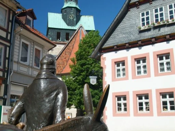 Wir starten unsere Wanderung in Osterode am Harz. Das Einstiegsportal am Parkplatz „Bleichestelle“ ist leicht zu finden. Zuvor haben wir auf unserem Bummel durch die historische Altstadt schon das imposante Rathaus bestaunt, das frühere Harz-Kornmagazin. Von hier starteten einst die Eselskarawanen hinauf in den Oberharz. Auf dem heutigen Harzer-Hexen-Stieg brachten Sie den Bergleuten das notwendige Brotgetreide, denn Ackerbau war und ist im rauen Klima dort kaum möglich.