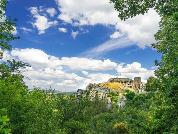 Kurz nach der Sitzgruppe halten Sie sich im Wald links. Der schöne, naturbelassene Weg führt relativ parallel zum Waldrand durch den Mischwald. Kurz vor dem Parkplatz zweigt der Weg Nr. 5 nach rechts ab und führt leicht bergan in Richtung Burg und Festung Regenstein. Einige steinige Passagen erfordern etwas Konzentration. In Kürze sehen Sie das Burgtor. Der Stempelkasten der Harzer Wandernadel steht davor.
