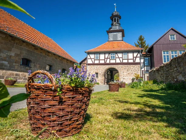 Die kreuzende Harzstraße/Schieferberg überqueren Sie und gehen den Schlossberg in Richtung Obere Mühle. Genießen Sie den Ausblick und im Sommer am Wochenende eine Erfrischung auf der Terrasse bevor Sie den Anstieg zum Schloss meistern. Bei einem Blick in den Innenhof spüren Sie den Hauch des Glanzes höfischer Zeiten. Der historische Rundwanderweg führt an dieser Stelle um das Schloss herum und hinab zum Ausgangspunkt durch den Schlosspark.