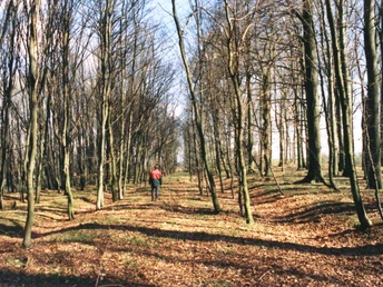 Danach geht es auf dem südlichen Ast des Karstwanderwegs weiter über Erdfälle, die im jüngeren Gips des Zechsteins durch Gipsauslaugung entstanden sind, etwa dem wassergefüllten „Grundlos“. Auch von hier eröffnen sich schöne Panoramen auf den südlichen Harz. Der Weg kreuzt jetzt die Trasse der unfertig gebliebenen Helmetalbahn.