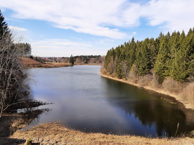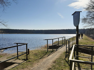 Ab hier fahren wir weiter über den Damm und folgen im weiteren Verlauf dem Dammgraben bis zur Kreuzung „Tote Männer Tal“ / „Schlackenweg“. Wir nehmen den „Schlackenweg“ bis ganz oben, biegen links ab und folgen ca. 200m der B242. Auf Höhe der Einfahrt zum Polsterberger Hubhaus überqueren wir die B242 und folgen der Beschilderung „Huttaler Graben“/“Huttaler Widerwaage“.  Nun erreichen wir den Parkplatz „Entensumpf“, von welchen wir dann die Straße überqueren und dem schmalen Wanderweg am Hirschler Teich vorbei bis zur Weppner Hütte am Jägersbleeker Teich folgen. Für eine kurze Verschnaufpause besteht die Möglichkeit, eine kurze Rast in der Weppner Hütte einzulegen.