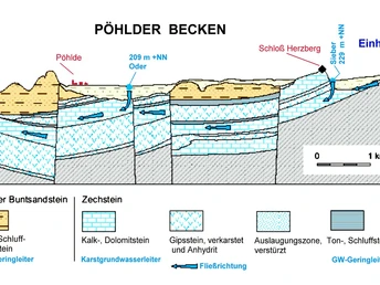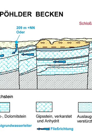 Wir starten an der Rhumequelle. Diese größte Karstquelle Norddeutschlands bezieht den Hauptanteil ihres Wassers aus den Versickerungen der Harzflüsse Oder und Sieber. Diese Versickerungsstellen liegen rund 50 - 60 m höher als der Quelltopf der Rhumequelle. Erdfallreihen zeigen den unterirdischen Lauf des Karstwassers an der Erdoberfläche an. Am Standort sind die verkarsteten Zechsteinschichten gegen den Buntsandstein verworfen. An dieser Störung steigt das Wasser auf.